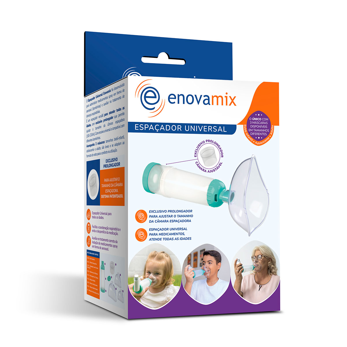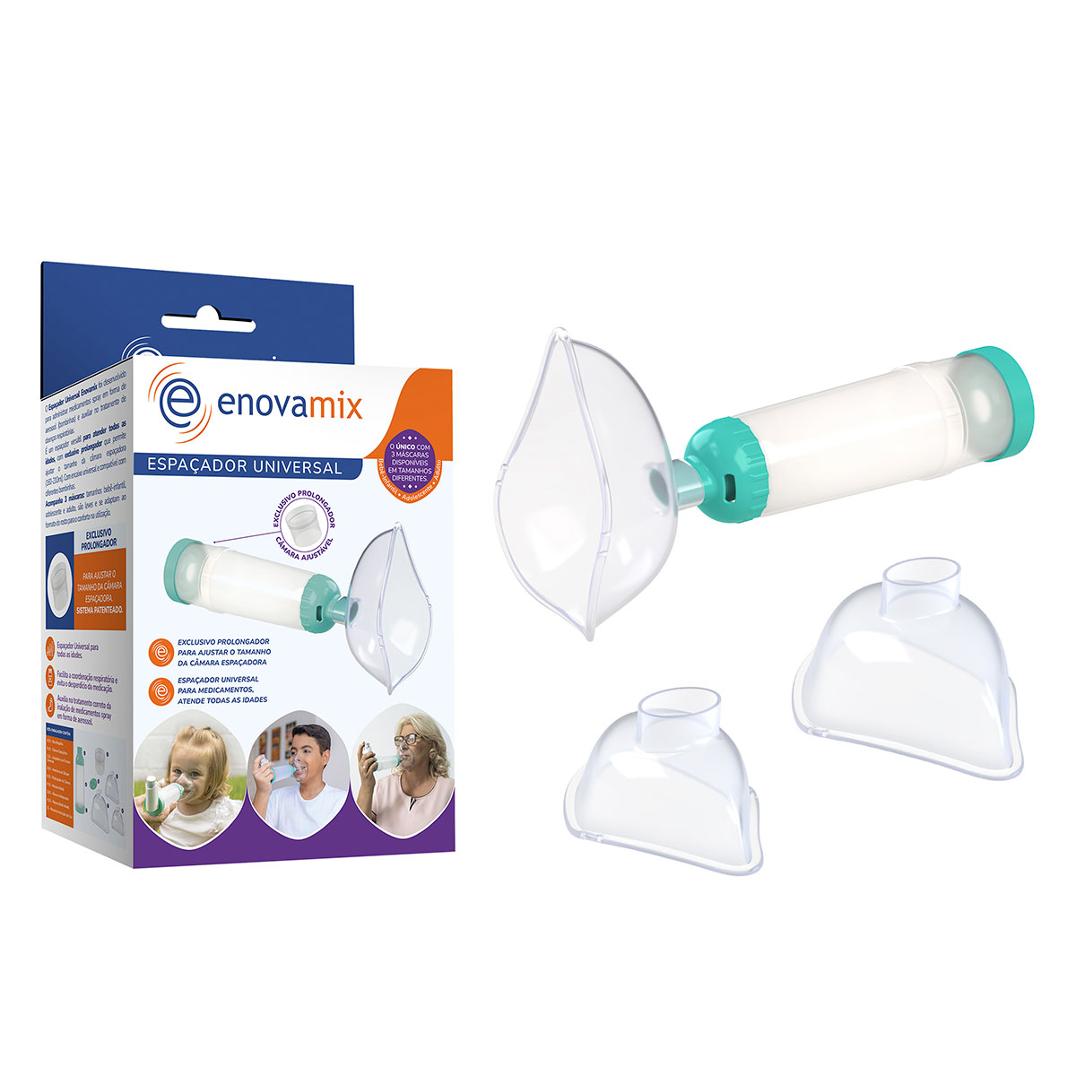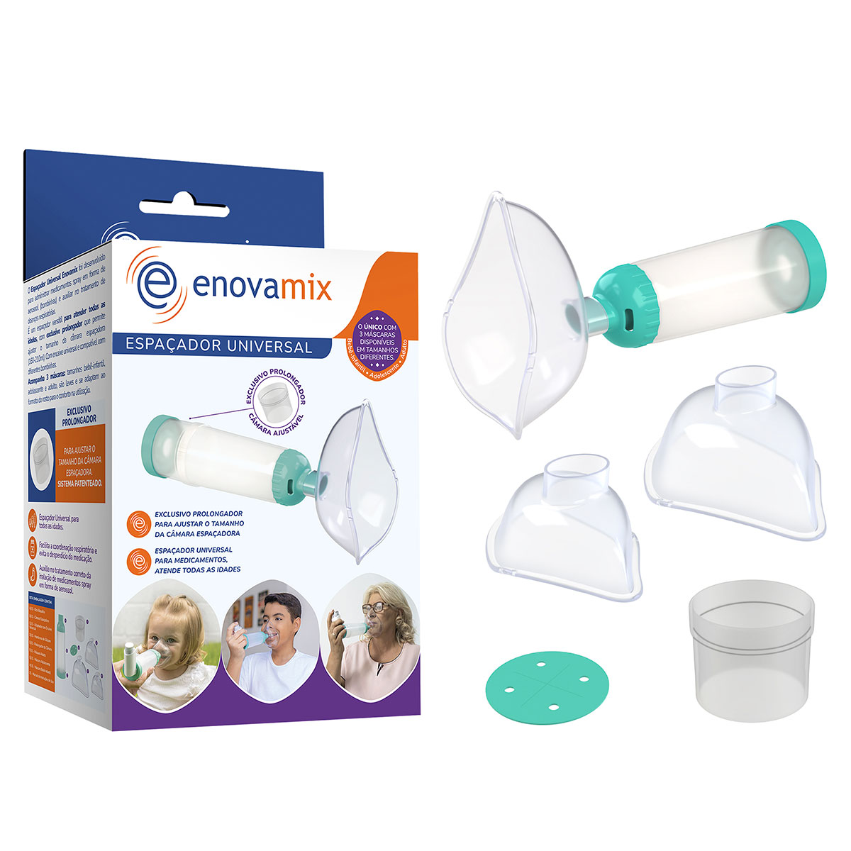 Espaçador Universal para todas as idades. Possui exclusivo prolongador para uso em adultos e 03 máscaras nos tamanhos bebê-infantil, adolescente e adulto. Com adaptador universal para variados tipos de bombinhas.