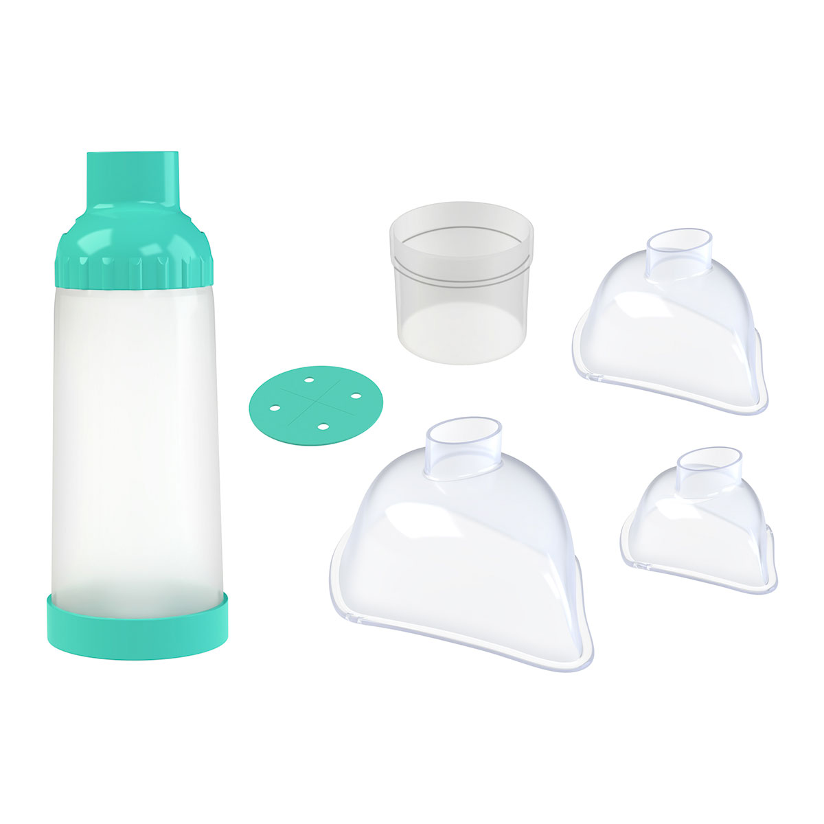 É um espaçador versátil, totalmente adaptável para atender todas as idades. Com exclusivo prolongador que permite ajustar o tamanho da câmara espaçadora (160-210ml) e encaixe universal compatível para utilizar em diferentes bombinhas. Acompanha 03 máscaras nos tamanhos bebê-infantil, adolescente e adulto, são leves, anatômicas e confortáveis.